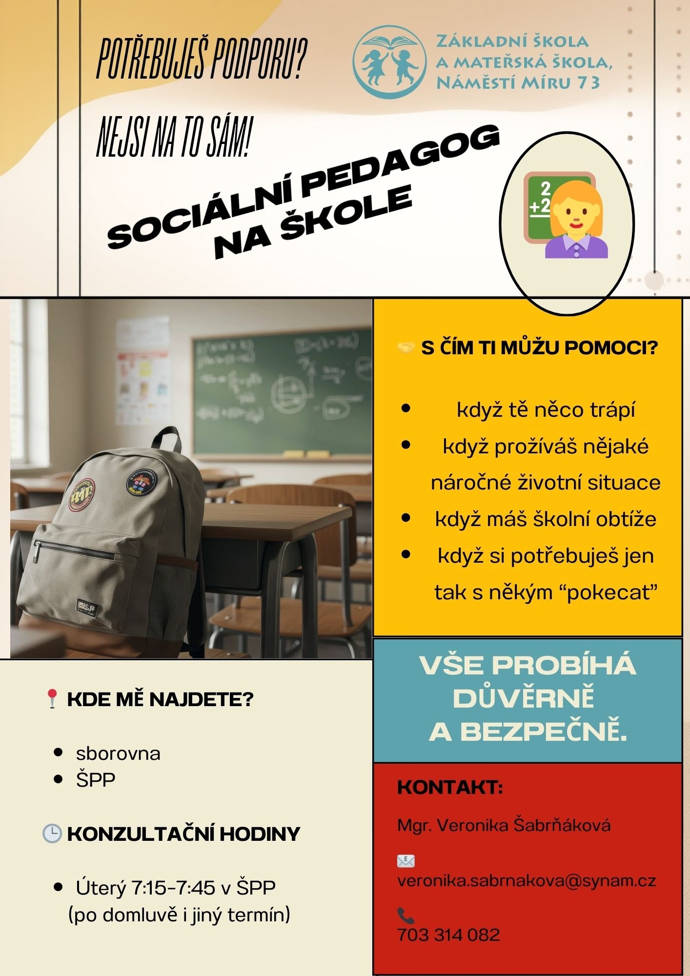 Dovolte mi představit Mgr. Veroniku Šabrňákovou, která se snaží podporovat žáky v jejich osobním rozvoji a pomáhá jim vytvářet bezpečné a podnětné školní prostředí, a to ve spolupráci s pedagogy, školním poradenským pracovištěm i externími organizacemi. Zaměřuje se především na prevenci rizikového chování, poskytuje individuální a skupinovou podporu žákům, pomáhá při řešení konfliktů, podporuje začleňování žáků do kolektivu, podporuje spolupráci mezi školou a rodinou tak, aby měl žák podmínky pro úspěšné vzdělávání i osobní rozvoj.