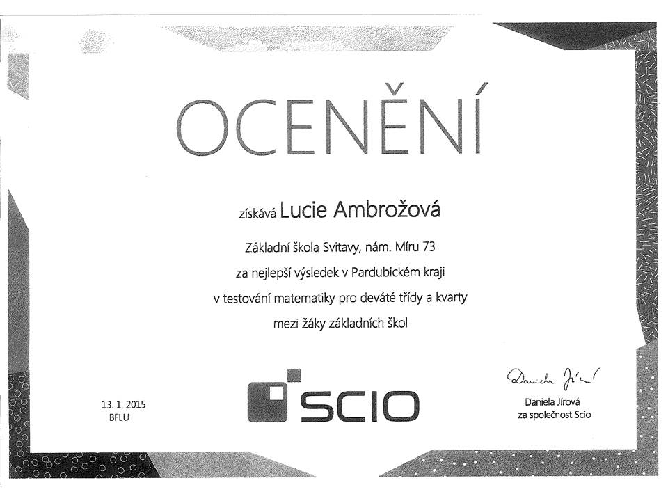 Lucka Ambrožová je žákyní 9. třídy. Patří k nejlepším žákům školy, dosahuje výborných výsledků. V testování SCIO obdržela diplom za nejlepší výsledek v našem kraji.