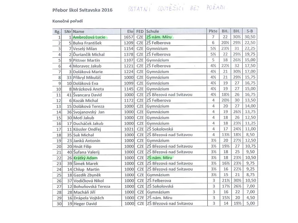 Dne 26.1. 2016 se žáci naší školy zúčastnili Přeboru škol Svitavska v šachu. Konečné pořadí zahrnuje pouze prvních 30 účastníků.