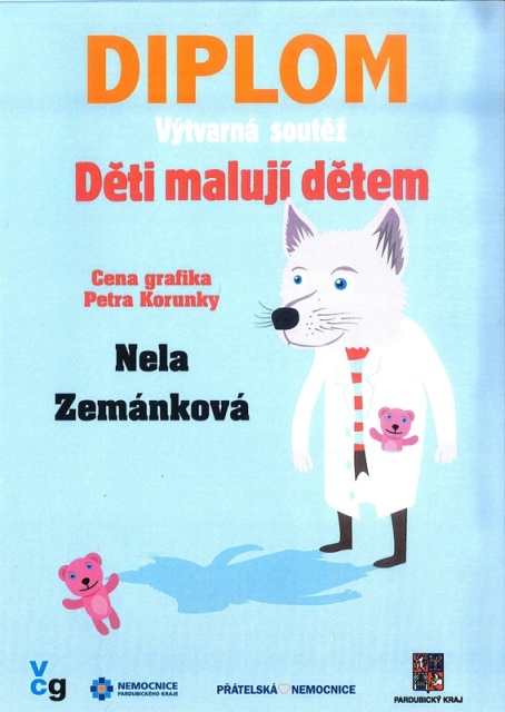 V listopadu se žáci naší školy zúčastnili výtvarné soutěže Děti malují dětem, kterou vyhlásila akciová společnost Nemocnice Pardubického kraje v rámci programu Přátelská nemocnice. Velkým úspěchem bylo ocenění obrázku naší žákyně Nely Zemánkové z 5.B cenou grafika Petra Korunky. Blahopřejeme.