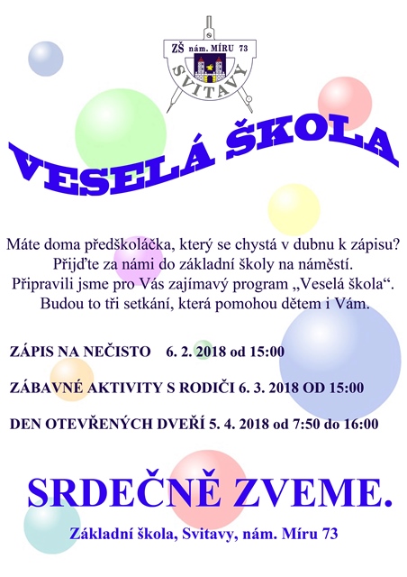 Máte doma předškoláčka, který se chystá v dubnu k zápisu? Přijďte za námi do naší školy na náměstí. Připravili jsme pro Vás zajímavý program „Veselá škola“. Budou to tři setkání, která pomohou dětem i Vám.