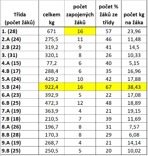 Nejlepší třídou se stala 5.B, jejíž žáci donesli celkem 922,4 kg. Gratulujeme!