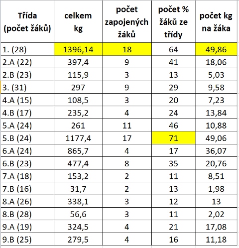 Přinášíme výsledky jarní soutěže ve sběru starého papíru. Děti nasbíraly se více než 6,5 tuny, což je úctyhodný výsledek. Děkujeme všem zapojeným žákům a také jejich rodičům.