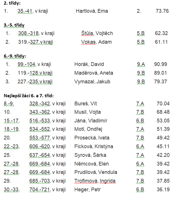Letošního ročníku se zúčastnilo 95 žáků školy. Konkrétně 26 žáků ze 2. - 5. tříd a 69 žáků ze 6. - 9. tříd. Do krajského kola nepostoupil žádný zástupce školy, ale výsledky 2. stupně jsou slibné. Především žáci 6. a 7. tříd jsou nadějí pro další rok. Rovněž výsledky dětí 2. tříd jsou příslibem do dalšího ročníku.