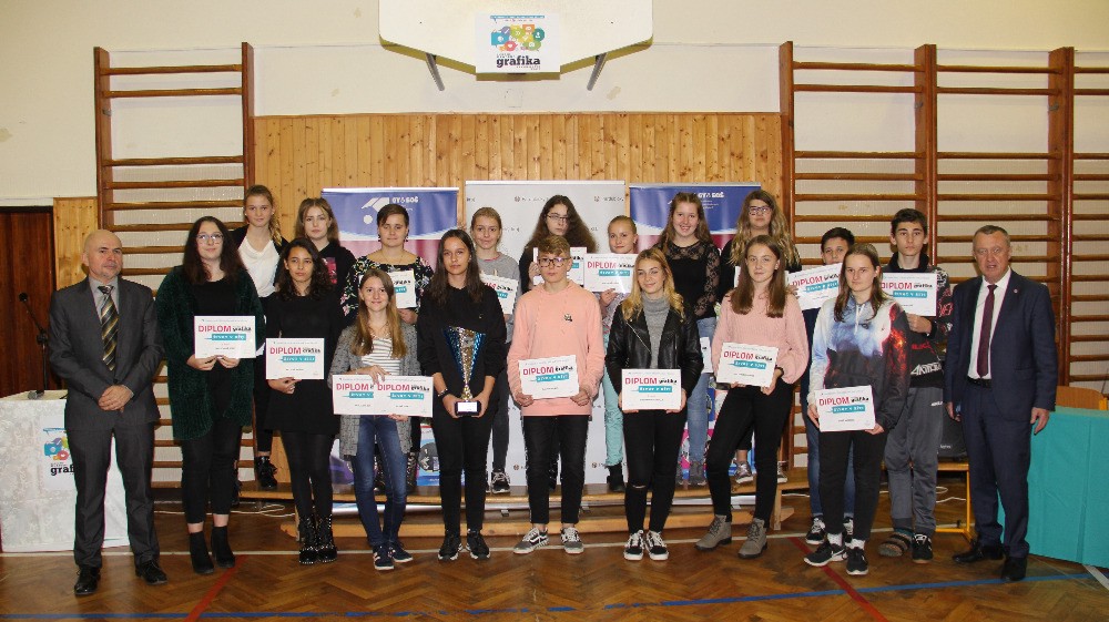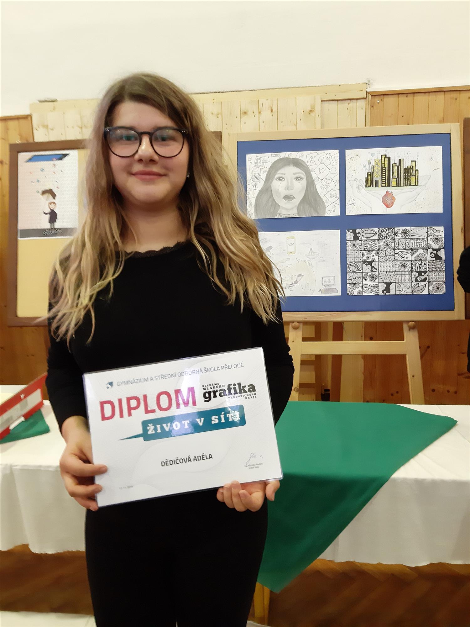 Osm žáků naší školy se zúčastnilo soutěže Hledáme mladého grafika Pardubického kraje pořádané Gymnáziem a SOŠ Přelouč. Téma 1. ročníku soutěže bylo "Život v síti". Ze 78 odevzdaných prací z 18 základních škol bylo vybráno 20 nejlepších grafických prací, z nichž 5 nejlepších dostalo hodnotné ceny. Na krásném sdíleném 6. místě se umístila žákyně 9. A Adéla Dědičová. I ona získala zajímavé ceny. K ocenění jí moc gratulujeme. Nechť je inspirací pro ostatní žáky v příštích ročnících.