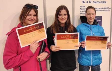 V celostátním kole mezinárodní robotické soutěže RoboRAVE 2022 jsme získali cenné úmístění. Naši osmáci sestavili celkem tři týmy, které se zúčastnily robotického klání v Pardubicích. Byl to první ročník, kam jsme přivezli naše zbrusu nové roboty. Proto jsme soutěž brali hlavně jako možnost sbírat zkušenosti. I tak se týmu ve složení Dimitrios Agos, Elen Němcová a Klára Klusáková podařilo vybojovat krásné 3. místo. Blahopřejeme.