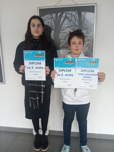 Hned dva naši žáci se skvěle umístili ve svitavském oblastním kole recitační soutěže pro mladé talenty. Přehlídka dětských recitátorů se konala v předposledním únorovém týdnu v divadélku Trám a z druhého stupně na ní skvěle reperezentovali Matěj Havránek (6. A) a Viki Zemanová (7. A), kteří ve své kategorii získali mezi dětmi ze škol svitavské oblasti druhé a třetí místo a postupují tak do okresního kola. Matějovo vystoupení bylo obohaceno o přednes jeho vlastního básnického kousku, kterým si získal sympatie poroty, a samozřejmě i přítomného publika. Děkujeme oběma umístěným, ale i všem ostatním recitátorkám, za jejich poctivou přípravu a odvahu předvést svoje umění na prknech, která znamenají svět.