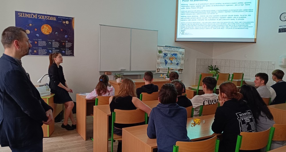 Aby naši žáci obstáli v životě před výzvami a nástrahami, které pro ně svět internetu a on-line služeb neustále připravuje, pozvali jsme do školy odborníky z praxe. O internetovém bankovnictví, bankovním účtu, platební kartě, dluhové pasti a především o bezpečném zacházení s nimi přišel žákům devátých ročníků prezentovat pan ředitel svitavské pobočky Raiffeisen bank pan Michal Franěk s kolegyní.