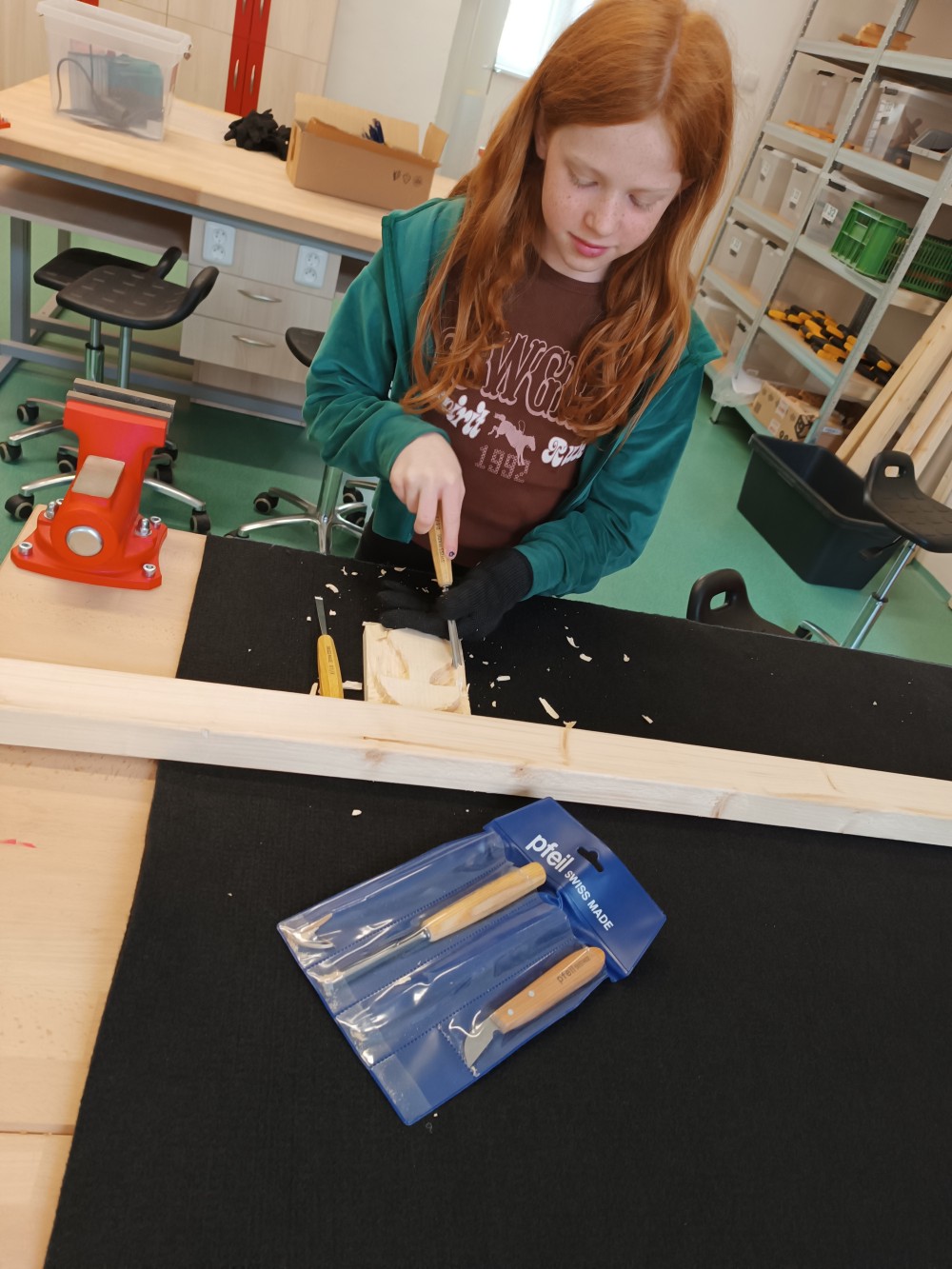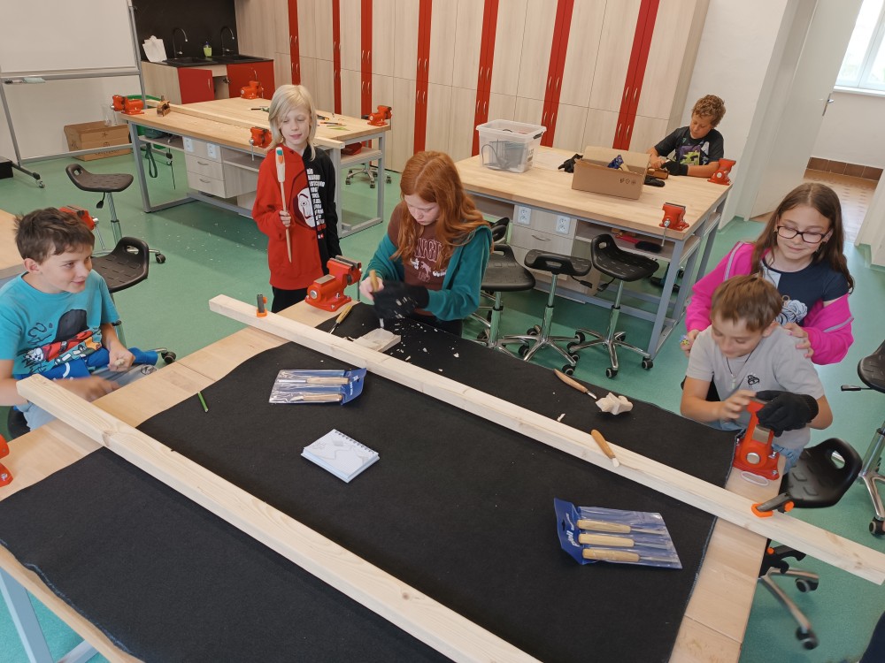 Na přiložených fotografiích můžete vidět naše žáky právě při výuce řezbářství.